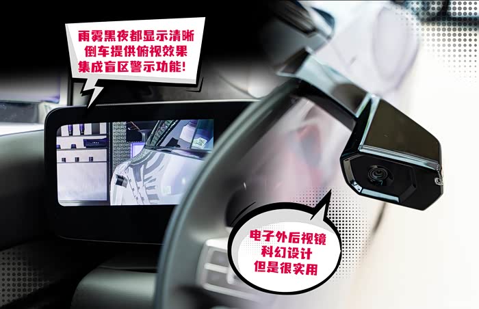 这个电子外后视镜其实挺实用的,即使是晚上还是下雨,它都可以保证清晰度,这是传统物理后视镜没办法比的,而车里的屏幕放置的位置也很考究,驾驶员既能看清楚屏幕显示的车后方情况,也能看到车窗外的情况,保证安全