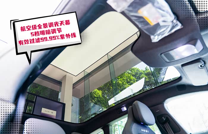 顶配车型的全景天幕可以实现5档明暗调节,比物理遮阳帘高级很多,而且还有效过滤99.99%的紫外线,不错不错