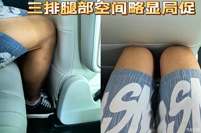 座椅:座椅的长度(48CM)对腿的支撑性确实不错的,一二排标配通风加热,基本的诚意还是到位了,前排座椅较为宽敞,主驾腰托调节支撑感比较足,设计师是自己体验了的;二排座椅老板椅前方配置了航空小桌板,高度差设置的比较合理,显然经过了精心设计,况且老板椅坐垫可随靠背一起调节,普适性更好,其他如小挂钩、隐藏式杯架则体现了设计师生活化的考虑。这种三排六座SUV,其实二排腿部空间是不让人担心的,我专门测量了二排腿部空间,最让人担心的就是三排座椅的是否够宽敞,我将二排座椅固定,1.76的个头坐进去不顶头,同时腿部空间虽说不上宽敞,但也不会显得狭窄,并且我也测量了三排座椅的宽度,达到了101CM,所以左右坐着是绝对不拥挤的,另外,三排座椅靠背是可依据个人身高调节的,这就更让我坚信了三排座椅对于一般人基本是够用的,在这种车型中算中等的。