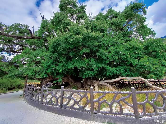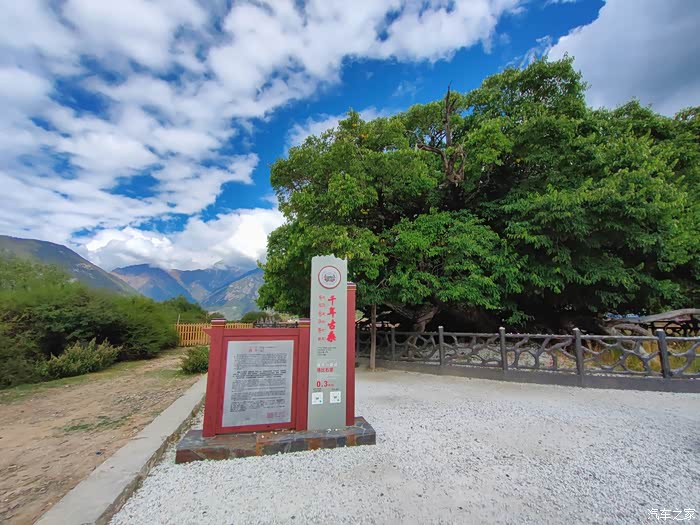 千年大桑树,传说是由松赞干布和文成公主亲手种植的,树干硕大挂满了哈达,树的背后即是南迦巴瓦雪山。而向下看则是峡谷内河边的美丽村落,若在三四月份前来,桃花盛开,团团拥簇在河边的绿色原野上十分美丽,是摄影的绝佳机会。