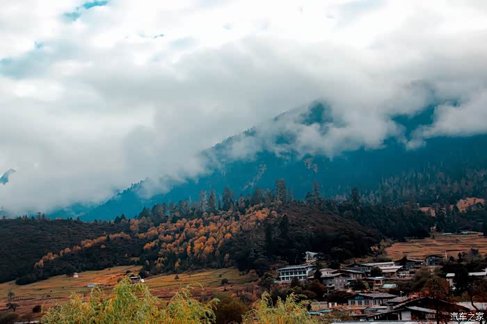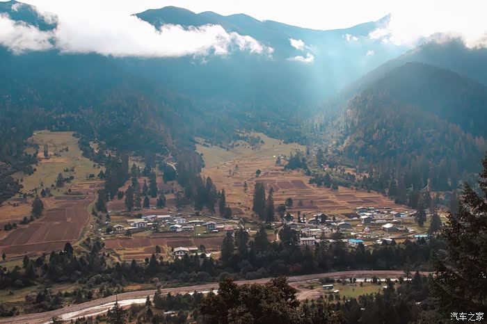 一家家错落有致的农舍,配带着薄薄的晨雾与低云,还有远处若隐若现的远山,真是一幅令人心旷神怡的画卷。
