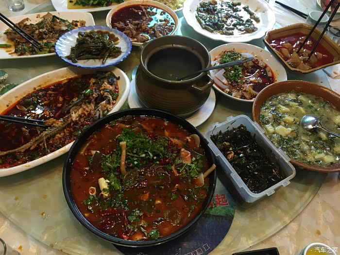 因为其实我们的小伙伴们都不算勤快,起的不早,还有一个车的小伙伴因为早上从眉山过来~迟到了~~所以~我们一行愉快的决定在汶川吃午饭,本姑凉来过好多次汶川,推荐了一家物美价廉味道巴适的餐厅,美丽的菇凉还带了自己拌的海带丝,靠谱的小伙子带了打包的眉山凉拌鸡~~