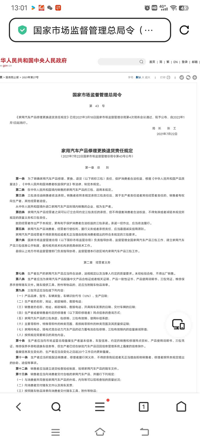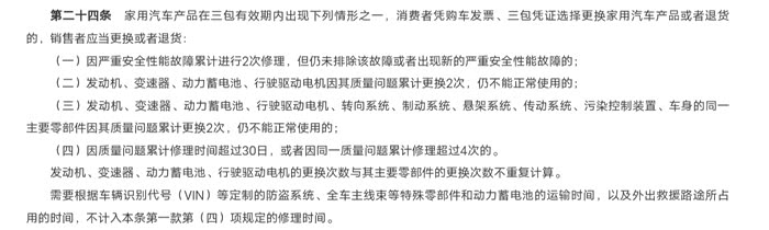 家用汽车产品在三包有效期内出现下列情形之一,消费者凭购车发票、三包凭证选择更换家用汽车产品或者退货的,销售者应当更换或者退货: