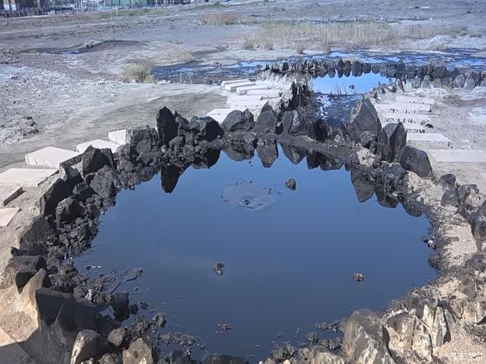 在“山顶”的油池泉眼旁边,遇到了两个70多岁当年克拉玛依石油大会战的建筑工人,一个山东人一个东北人,二人从各自的家乡约好在克拉玛依会面来寻找青春时的足迹。他们也是惊讶不已:这里当初也与停车场一样的高度,几十年不见,怎么冒出了一个小山包?看看下面的图片就知晓答案了。
