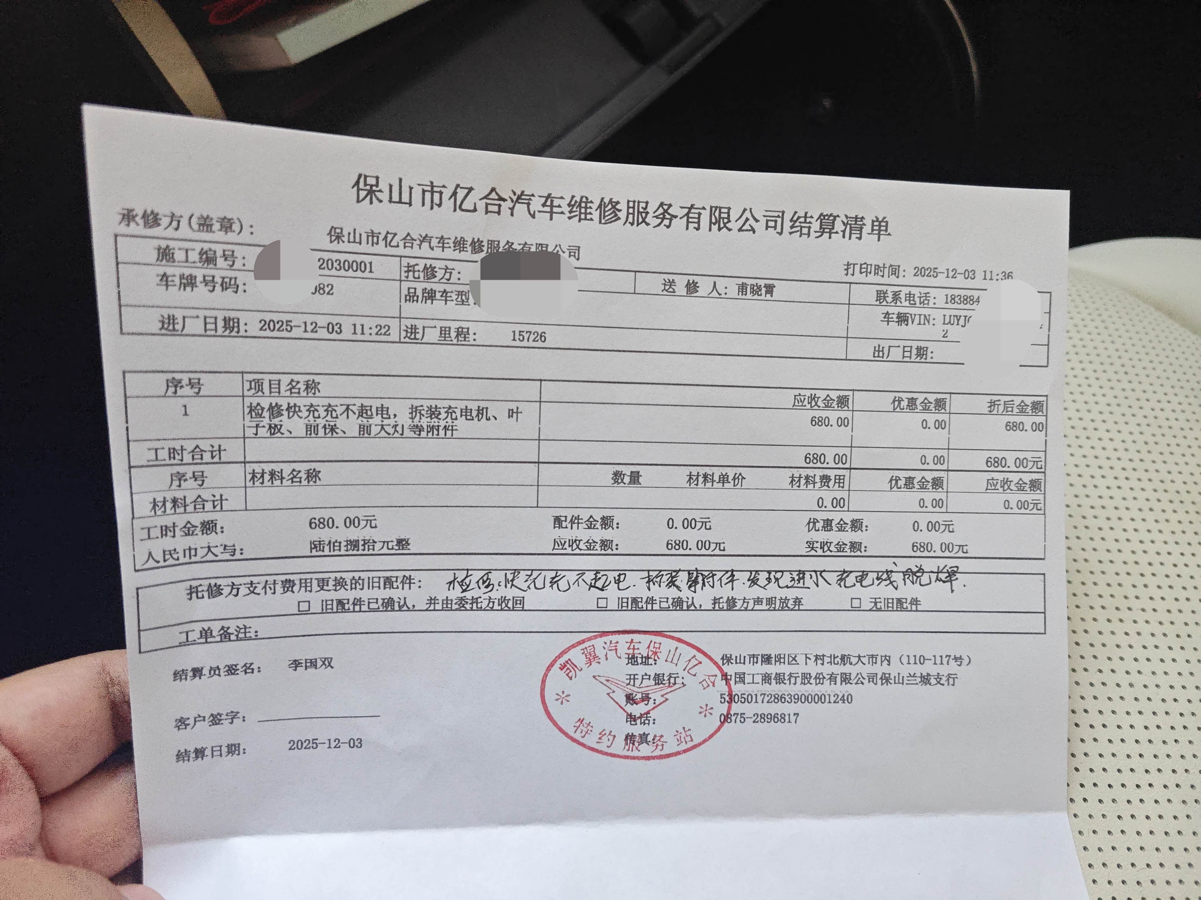 检查过程产生680拆装检查费,且被告知快充充电模块只有一年质保。需要自费维修。无法充电原因居然是线路虚焊脱落。