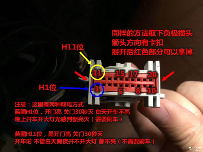 第三种:副驾保险盒F12 H11取电(不需要刷车) 是开门亮,关门30秒灭,开车时,不管白天黑夜开不开大灯,都不亮。