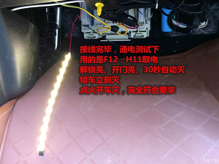第二种:副驾保险盒F12 H1是原车氛围灯取电(需要刷车) 开门亮,关门30秒灭,白天开车不亮,晚上开车开大灯光感判断亮灭。