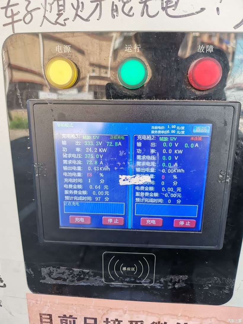 刚从物流车上卸下来时,表显电量只剩28%,跑到家里电量只有18%。第二天到充电桩快充,发现有点问题,充到85%后速度很快,一下就显示充满了。然后根据已充入的电量换算百分比,发现快充只能充入41度左右,比标称的47度少6度。
