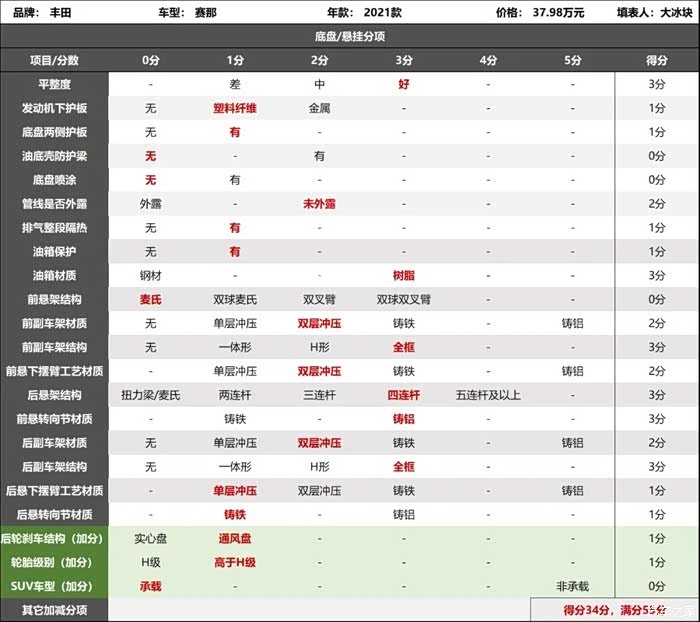2021款丰田赛那底盘评分