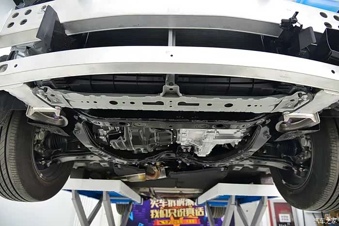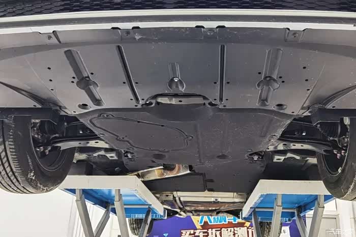 这辆车护板完整,平整度总体来说还可以,但是发动机油底壳向下凸出,有被磕碰的风险。