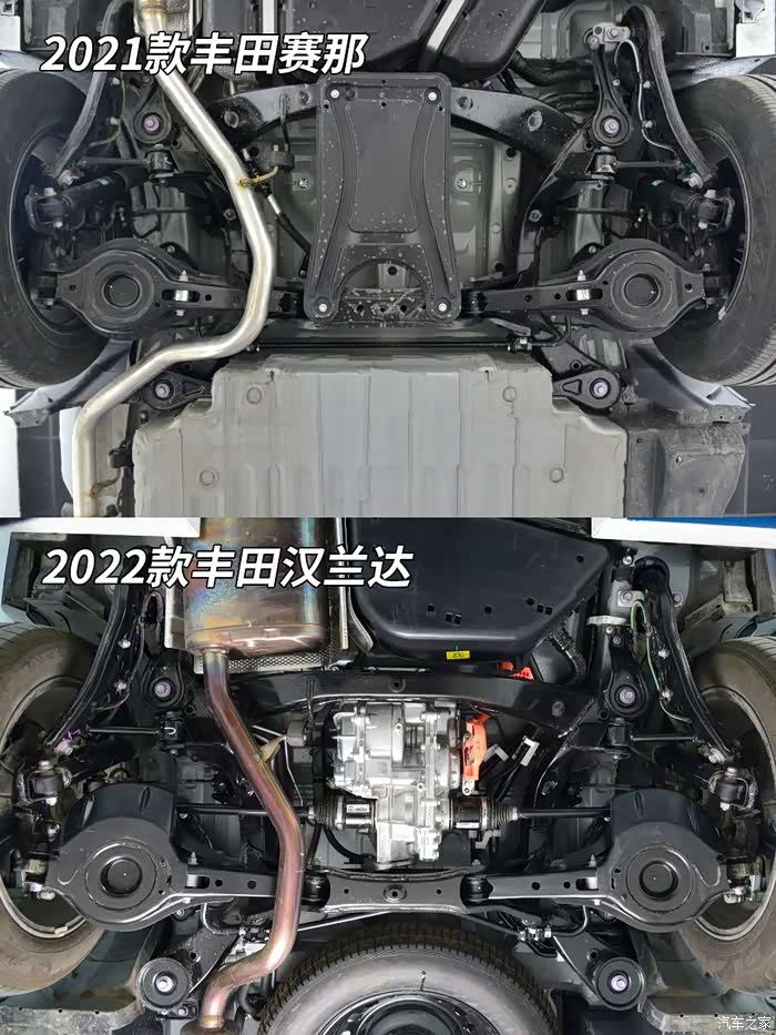 国产赛那并没有后电机,但能看到后副车架为电机预留了安装位置。因此未来有可能和汉兰达一样,会有带后电机的四驱版本上市。