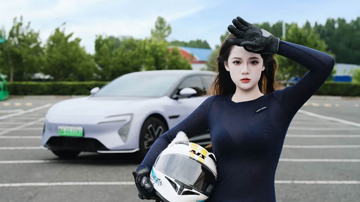 穿着骑行服,站在阿维塔06旁边,一个是她曾经最爱的机车,一个是她的新伙伴,画面毫无违和感
