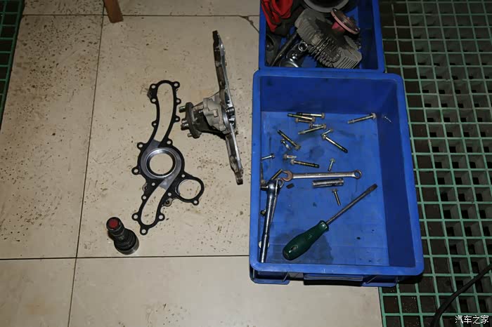 拆卸的旧水泵,水泵螺丝单独用盒子放置,不和其他螺丝混淆