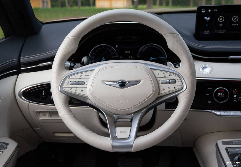我比较注重的驾驶可玩性方面我觉得捷尼赛思GV70表现的也是不错的,不得不夸一下动力给力,标配双电器四驱,百公里加速4.4s,动力是随叫随到的,而且操控很方便,方向盘上单独设置了BOOST按键,按下后仪表盘就会有个10秒的倒计时,就是进入打鸡血模式了,按下后座椅两侧护翼就会夹紧进入运动状态,这模式开起来很猛。细节配置有些我也挺喜欢的,比如带外放电,带孩子朋友野营就很方便。
