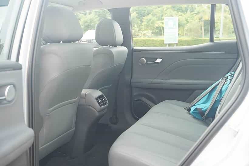 要说车里头的话,埃安i60空间算够用吧,毕竟只是紧凑车型,后排坐成年人还有些活动空间,中间位置脚底下是比较平整的,坐三个人的话,中间那位除了膝盖前面少点空间,其他都还行,最人性化的设计是靠背可以调整角度,20度范围内无极调节,同价位车里比较少见。