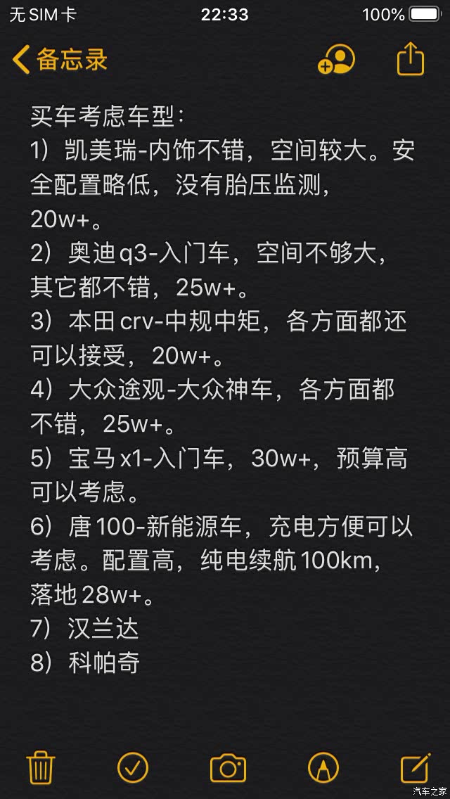 选车时,在各个品牌各个车型中挑选,当时做了个可选列表及主要优缺点。列举的车型有: