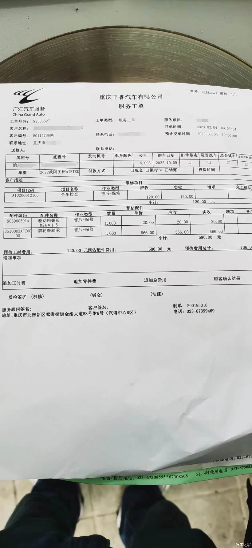 原本春节就发现了,因为要用车就拖了一段时间,2.15号做保养也顺带检查,结果是轮端轴承坏了,店里没有现成的配件,调货要一周多的时间也只能等了。3.3号配件到了,店里通知可以去维修了,3.4号到店开始维修。