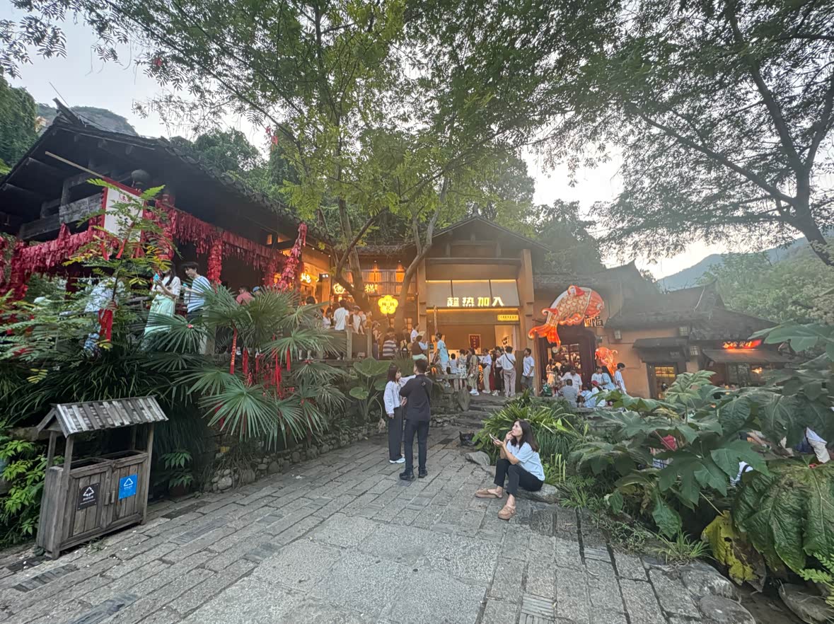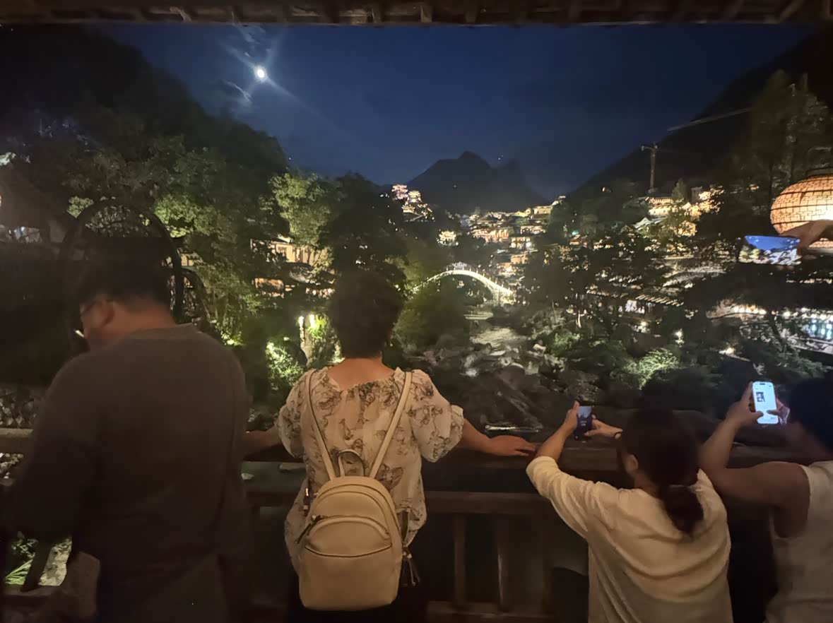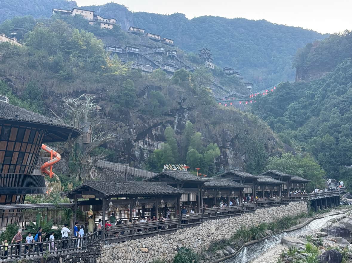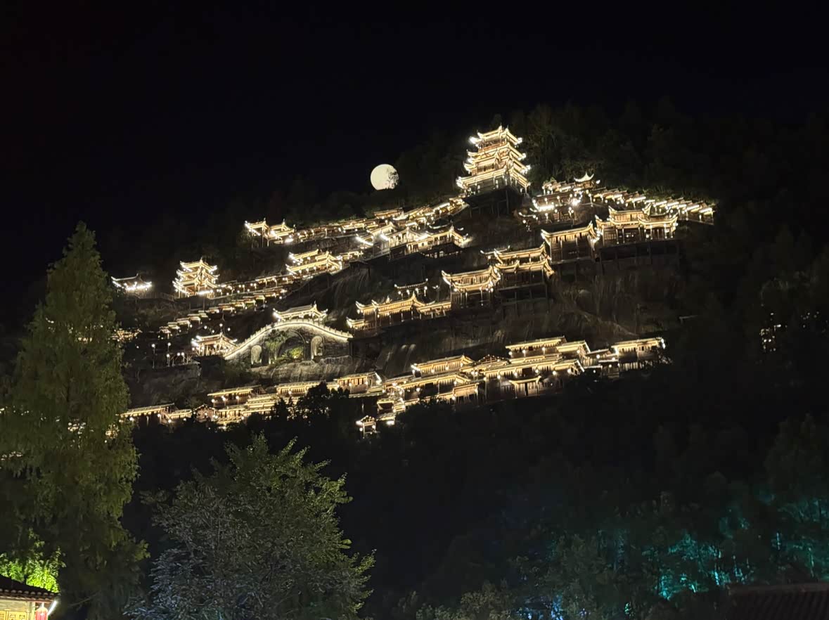当夜幕完全降临,望仙谷的灯光全部亮起,一场盛大的灯光秀惊艳上演,那场景至今想来仍让人震撼难忘。白鹤崖上的悬空玻璃客房在灯光映照下,如同镶嵌在绝壁上的璀璨明珠;岩铺老街的夯土房与碎石墙在红灯笼的映衬下,散发着浓郁的古朴气息;百米瀑布群在夜间灯光的照射下,水流如白练垂落,飞珠溅玉,灯光与水流交织出奇幻的光影效果。我们沿着溪边的石板路漫步,溪流在灯光照耀下波光粼粼,宛如流动的银河,潺潺的流水声与远处的欢声笑语交织在一起,格外惬意。这样如梦如幻的仙侠夜景,是望仙谷独有的浪漫,也成为了此行最惊艳、最难忘的风景之一。