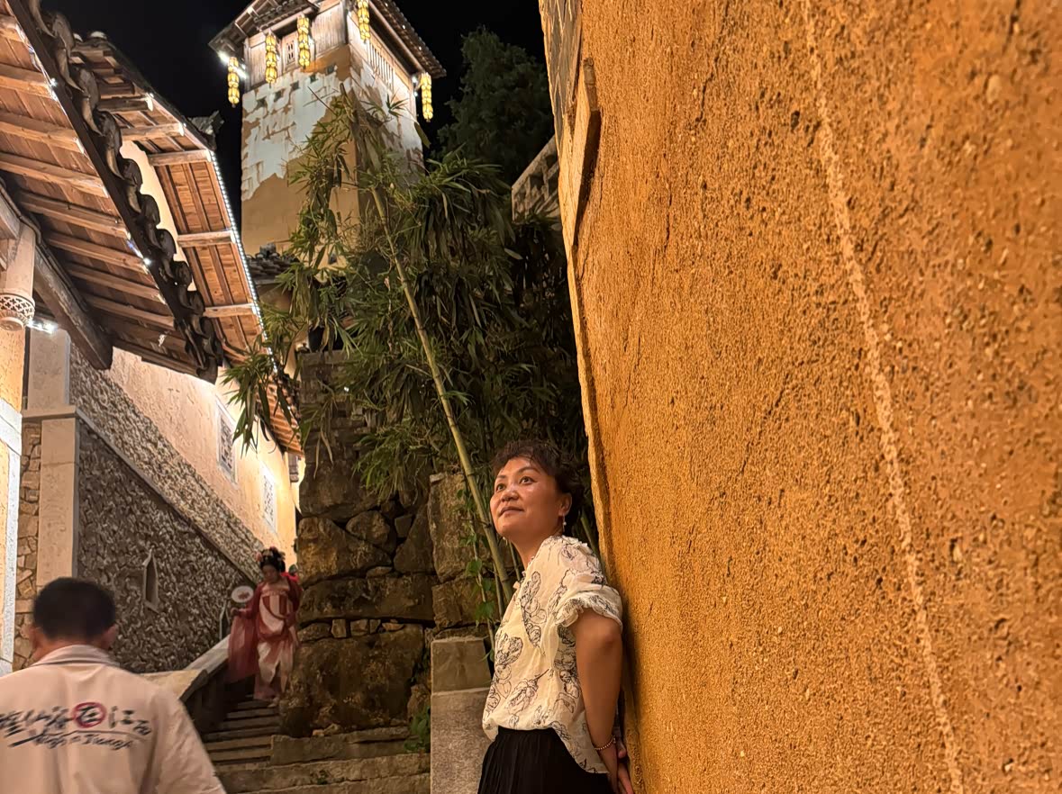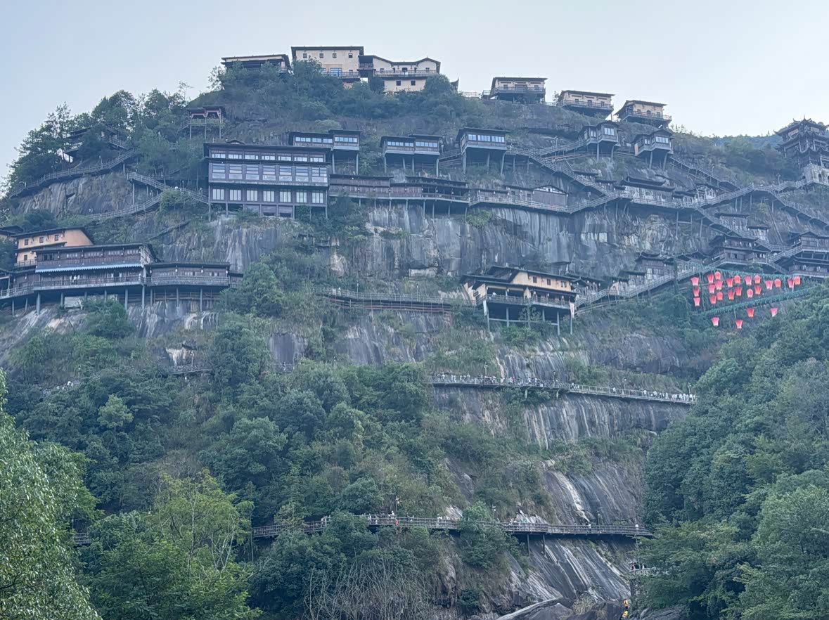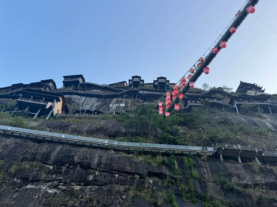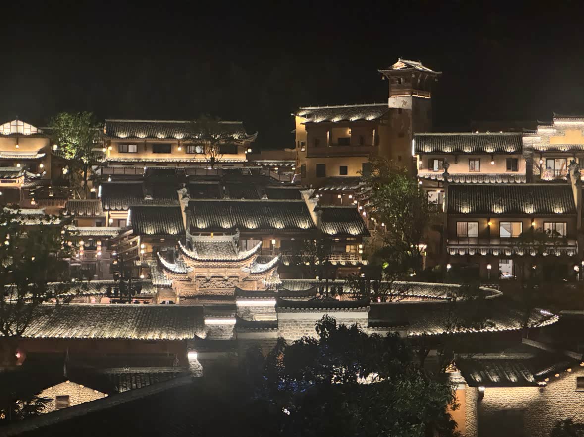 当夜幕完全降临,望仙谷的灯光全部亮起,一场盛大的灯光秀惊艳上演,那场景至今想来仍让人震撼难忘。白鹤崖上的悬空玻璃客房在灯光映照下,如同镶嵌在绝壁上的璀璨明珠;岩铺老街的夯土房与碎石墙在红灯笼的映衬下,散发着浓郁的古朴气息;百米瀑布群在夜间灯光的照射下,水流如白练垂落,飞珠溅玉,灯光与水流交织出奇幻的光影效果。我们沿着溪边的石板路漫步,溪流在灯光照耀下波光粼粼,宛如流动的银河,潺潺的流水声与远处的欢声笑语交织在一起,格外惬意。这样如梦如幻的仙侠夜景,是望仙谷独有的浪漫,也成为了此行最惊艳、最难忘的风景之一。