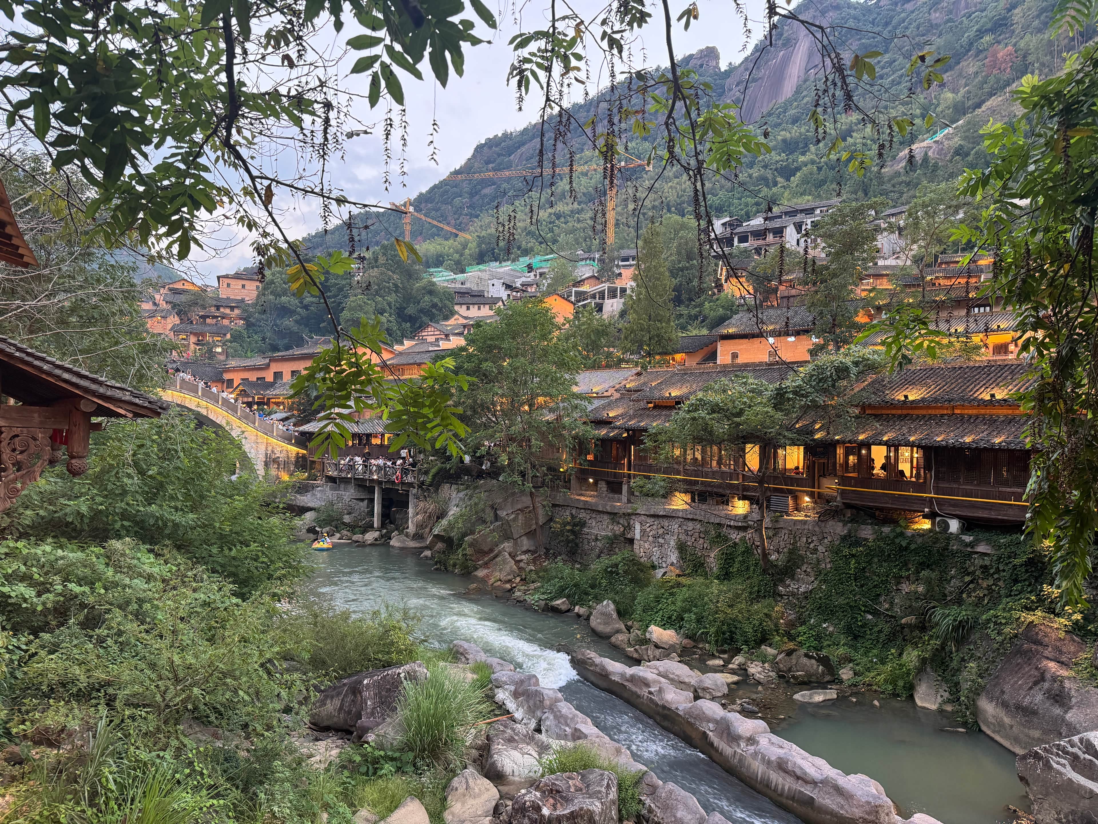 傍晚时分,夕阳的余晖为望仙谷镀上了一层温柔的金边,白日的喧嚣渐渐褪去,只剩下宁静与惬意。我们沿着溪边的石板路缓缓前行,揽月桥是观赏暮色的绝佳地点,百层花岗岩堆砌而成的桥身在夕阳映照下泛着温暖的光泽,与水中的倒影相映成趣。微风拂过,带来山间的凉意与草木的清香,身旁游客的轻声交谈、远处溪流的潺潺声响,构成了一幅治愈的山间暮色图。儿子拉着我们的手在桥上跑来跑去,还捡起路边的小石子轻轻扔进水里,看着泛起的涟漪哈哈大笑。我们停下脚步凭栏远眺,看着夕阳慢慢沉入远山,天空的色彩从金黄渐变为橘红、紫红,最后染上淡淡的深蓝,谷中的灯火也渐渐亮起,暖意融融。这样宁静美好的暮色,还有家人相伴的惬意,让人久久不愿离去,更深深烙印在记忆中。