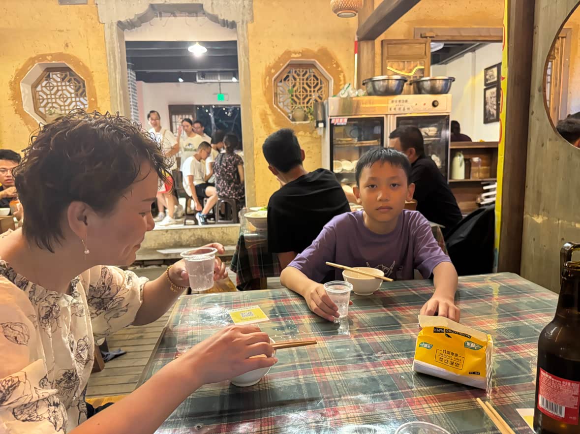 中午时分,我们沿着栈道下行,来到了充满烟火气的岩铺老街。这里的红糖工坊、豆腐坊等手工作坊沿街而设,尽显赣家民俗风情。儿子被豆腐坊的传统制作工艺吸引,非要亲手磨豆浆,老板笑着递给他一个小磨盘,儿子费劲地转着,脸上很快沾满了豆汁,逗得我们哈哈大笑。当品尝到自己亲手磨出的豆浆时,他脸上满是自豪的笑容。随后,我们在老街的餐馆里品尝了铅山烫粉、灯盏粿、农家土鸡汤等当地美食,每一口都是原汁原味的鲜香。一家人围坐在小桌旁,儿子不停地给我们夹菜,分享着沿途的见闻,温馨的氛围在空气中弥漫。这份质朴的烟火气、亲子互动的乐趣,还有家人间的温情,都成为了难以忘怀的温暖记忆。