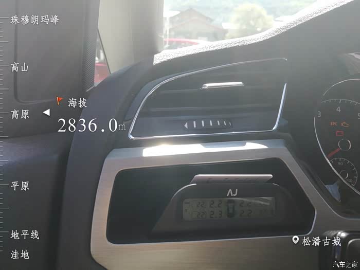 松潘县古城停车场海拔2836米,气温25.5摄氏度,安驾显示2.2bar,即220kPa;