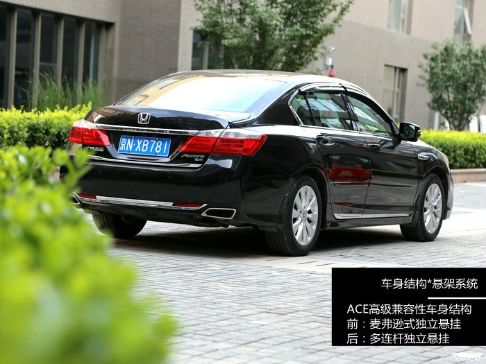 ▼从侧面看第九代雅阁,车身重心偏低,后面看,敦实,依旧是营造一种稳重的感觉,大面积的LED车尾灯,层次感强烈的三层镀铬条,梯形的双边排气口,充满了力量感。