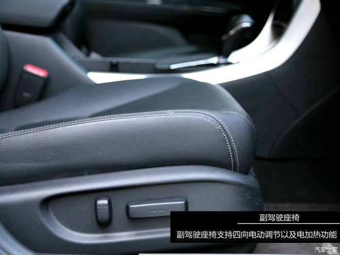 ▼副驾驶座椅支持四向电动调节,黑色真皮打孔,白色缝线,商务气息不那么浓重,套用一句俗话:宜商宜家