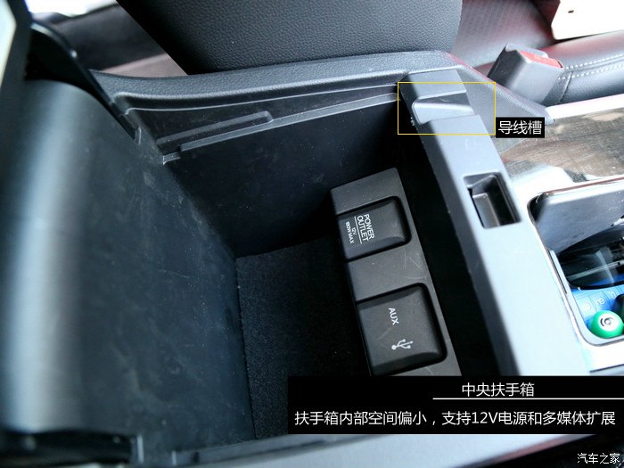 ▼中央扶手箱,牺牲了一部分内部空间,干什么了?一,扶手箱盖子伪装成了一个空气净化器,二,扶手箱里有一个车载12V电源,还有一个多媒体扩展接口,可以扩展AUX喝USB,导线槽的设计可以将电源线引出来。