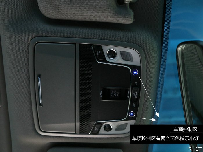 ▼前排车顶照明灯一样采用LED光源,特别要说的是这个两个小蓝色,别看小,确实在夜间能营造蓝色的氛围。因为这个部位下方的中控台,档把四周很多银色的装饰板或者装饰条,可以明显的反蓝色光。