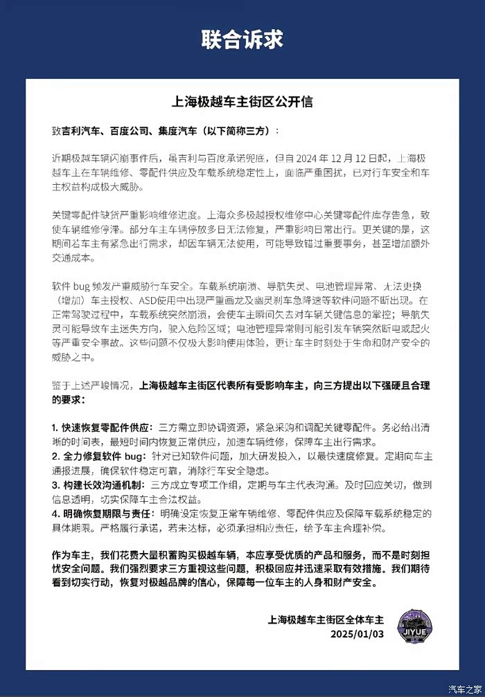 希望吉利和百度能够重视极越车主的合理诉求,尽快协调恢复极越售后体系,切实保障车主的合法权益。