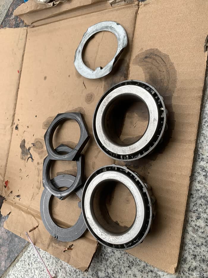 长途行驶四个轮毂轴承也是重点检查项目,因为全程多半高速。所以出发前拆下全部轮毂轴承进行了保养。具体步骤是,拆下车轮后用随车六角大套筒拆下两个锁母,取出轴承,取里边的轴承的时候得注意不要把轮毂油封弄破了。我是担心油封老化,之前就在网上买了四个轮毂油封和半轴密封纸垫,四个油封才12元钱,半轴纸垫4支8元钱。拆下轮毂轴承后用排刷蘸汽油洗干净轴承上的旧黄油,用柴油洗也可以。洗干净以后放在干净的纸板放几分钟,让汽油自由挥发。这时可以检查一下轴承的状态,正常的轮毂轴承经清洗后光亮如新,无锈迹和变色以及麻点,没有磨损破损的痕迹,并且转动自如无卡滞现象,反之则应予以更换新的轴承。经检查发现前轮有两个轴承有轻微的麻点和生锈。为了保险起见,到汽配店购买了2个同型号轴承进行了更换。