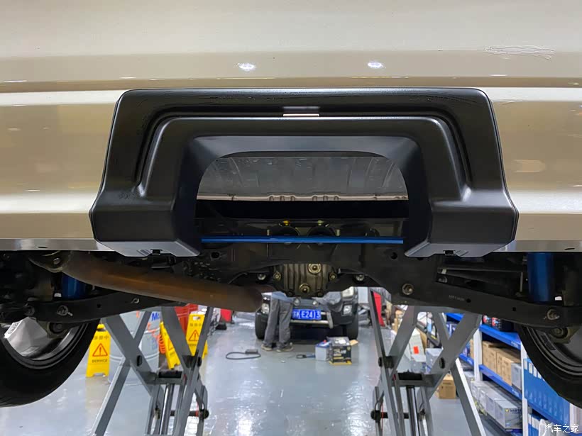而当顶把连接了左右塔顶、底盘加固件连接了左右悬挂底座时,它们整体自上到下组成一个框体,在加固了车架几何结构的同时将冲击力分散到整个车身来减弱力的传导。