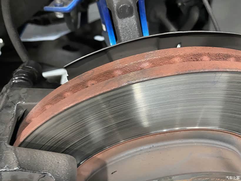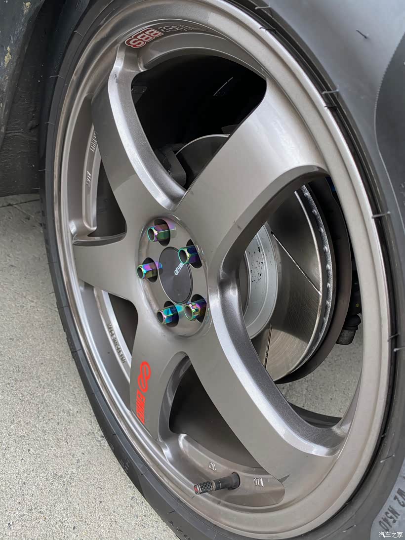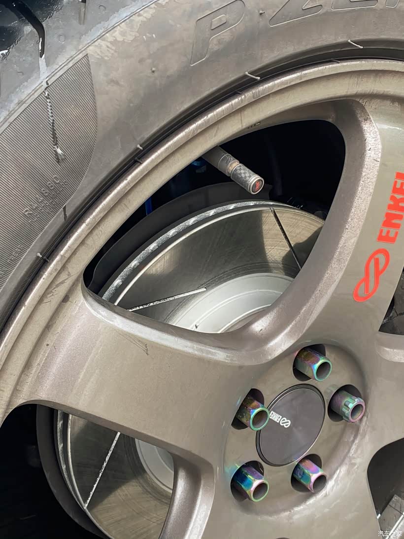 只是原厂的刹车盘耐热温度实在太低,跑完之后一直冒烟接近报废。另外除了刹车皮也磨的差不多了以外,我花了几百大洋喷的耀夜黑耐热卡钳漆也开裂……