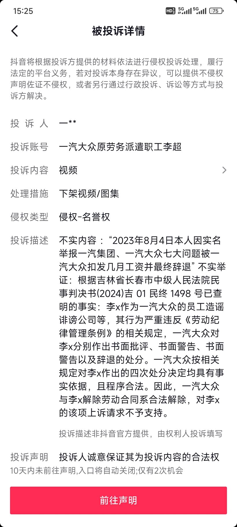 2、本人为维护公司利益反映这七大问题被一汽大众处罚直至辞退,(2024)吉01民终1498号;