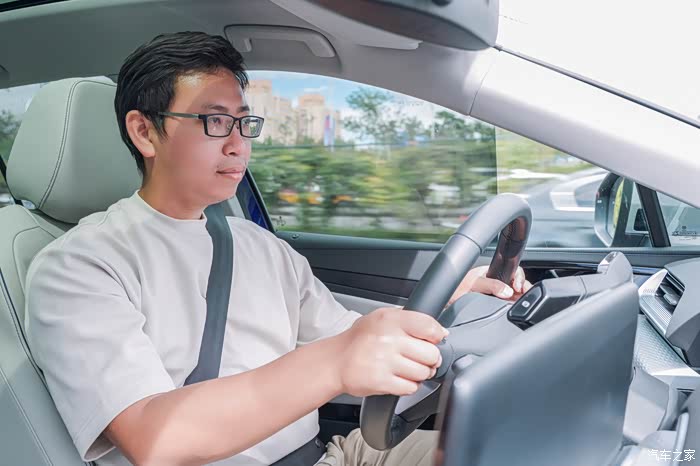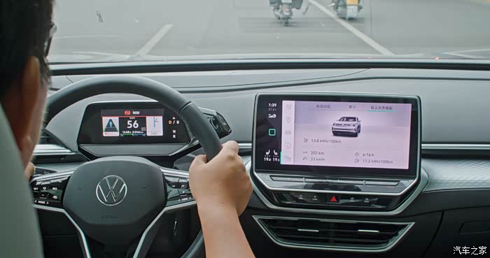 因为海哥一直容易晕车,我不敢开的太激烈。不过ID.6 X的动能回收模式比较智能,即使是在回收力度较大的B档位,很少因为收油产生突兀的减速。而当轻踩刹车时车子使用的是动能回收,只有重踩的时候刹车才会一并介入。这样的调校我还是第一次开,总体比较平顺舒适,反正海哥最后没有吐在车里