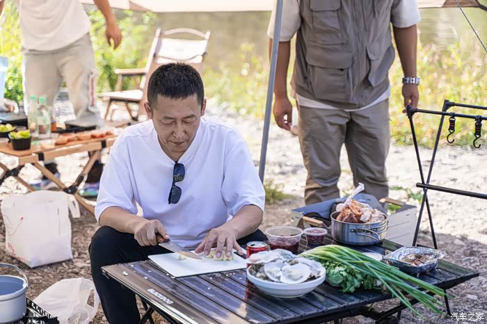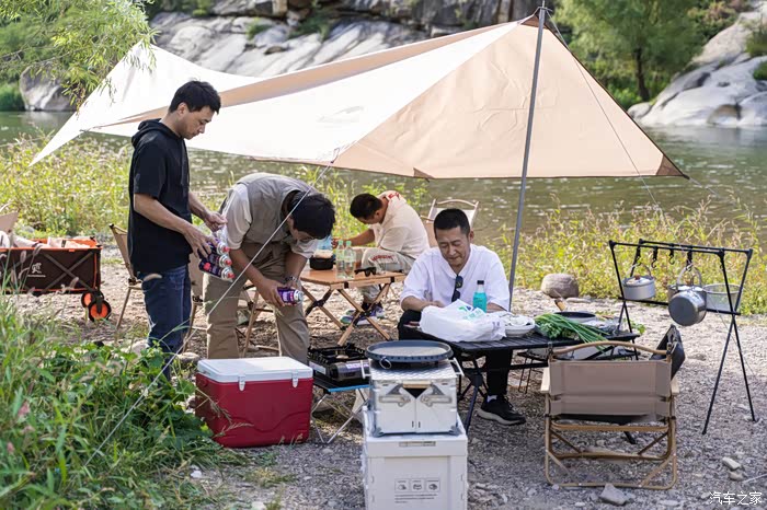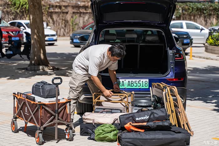 打开后备厢,搬出天幕、桌椅等露营装备,营地搭建搞起来!