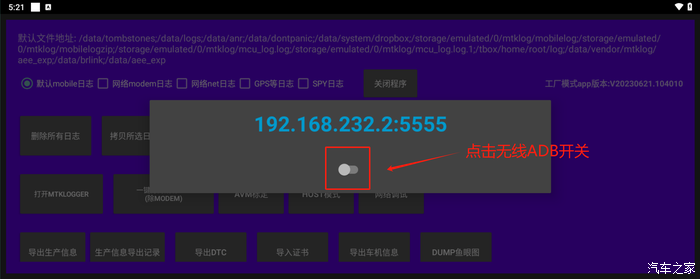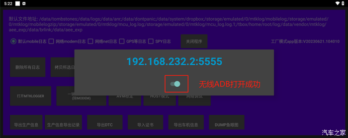 点击出现的无线ADB调试开关,待下方开关亮起即成功打开无线ADB,可以使用甲壳虫/atvTools等工具安装第三方APP了。(请跳过其他教程中拨号盘打开ADB的部分,上面步骤的目的与其一样)