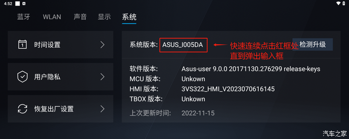 最后我们快速连续点击如图所示红框处的系统版本号,直到进入工厂菜单。