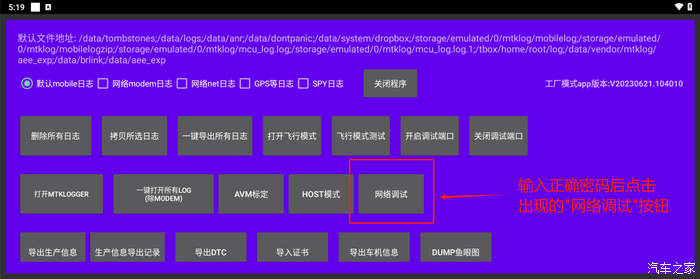 输入正确密码后会出现如图所示红框中的“网络调试”按钮,点击后会出现无线ADB调试开关。