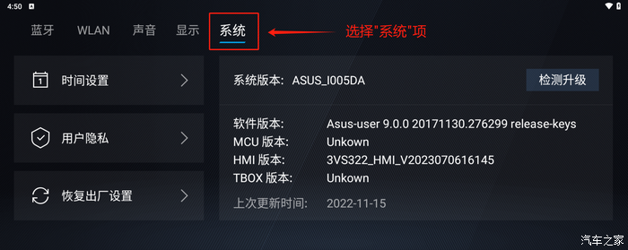 然后我们找到最后一个子菜单“系统”项,点击并切换到“系统”页面。