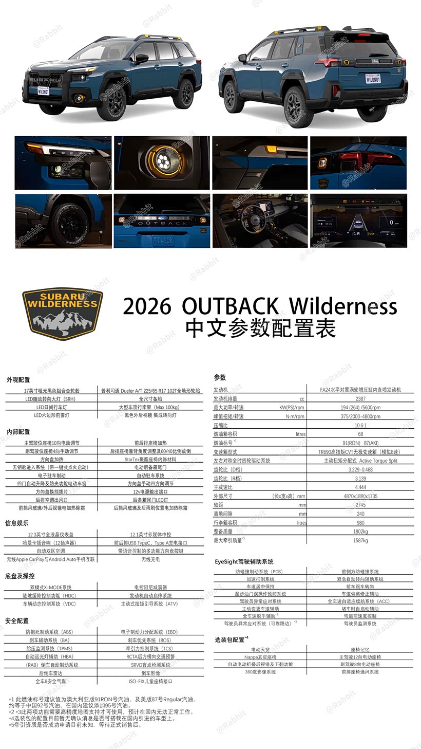 在今年2026款傲虎将以平行进口方式再度进入国内市场,目前该车型的引进还在逐步计划中,目前已知只有一个配置就是wilderness荒野版,由于此车在海外市场只有美国和澳大利亚进行销售,在日本工厂生产,沾这个光可以进行平行进口,左舵车型只有美版,所以中国能买到的只能是美版车型了,整车配置及参数也可以参照美版车型。