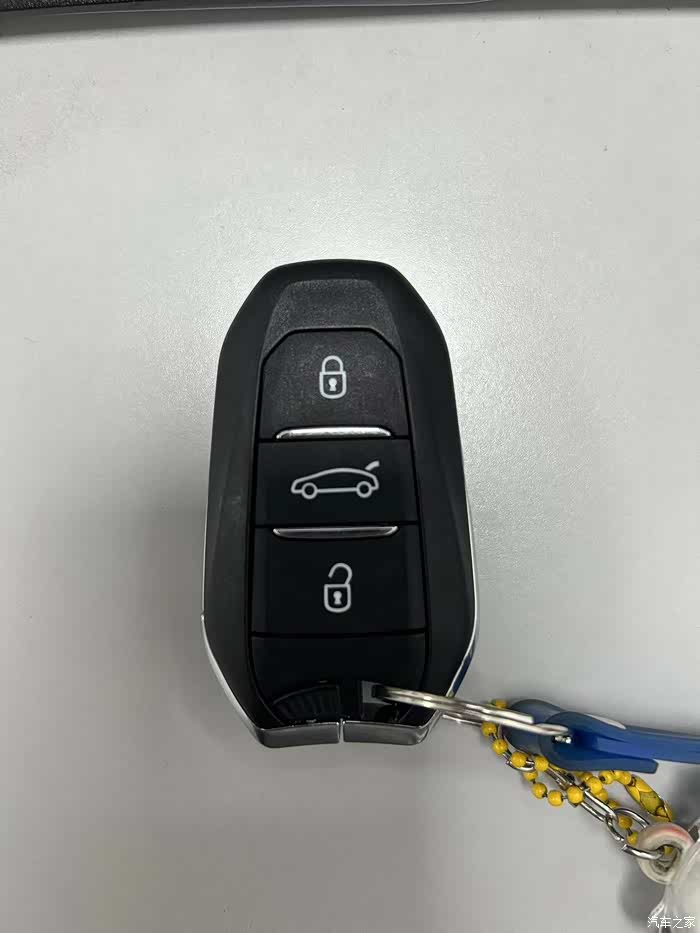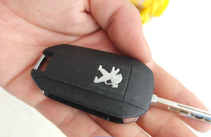 先说应急操作,第一步就是要开车门。标致的电子钥匙,是带有一个硬塑料材质的机械钥匙的。在钥匙的孔洞处,有个一按钮,拨动一下即可解锁。