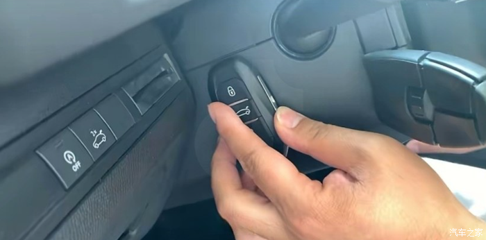 接下来就是点火了,因为钥匙没电了不能发送信号,所以要使用应急办法,在方向柱左侧,有一个钥匙形状的凹槽,将钥匙嵌入进去,然后正常点火操作即可。