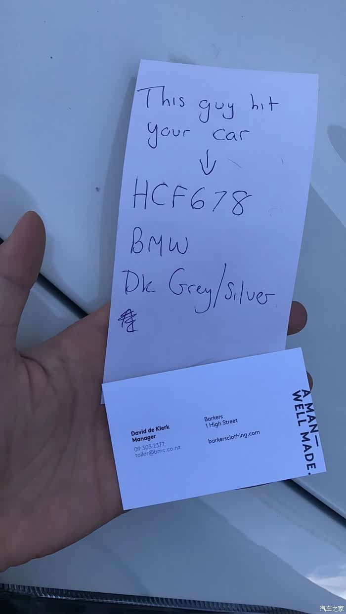 结果看到车前方插了个小纸条,还没有仔细看的时候第一反应是撞了我车的人留的,这人挺善良。结果一看,是车旁边的服装店员给我留的,对方车牌号,他留了一张他的名片,意思他是证人。如果有什么需要帮助的可以联系他。很感谢这位洋人小哥。