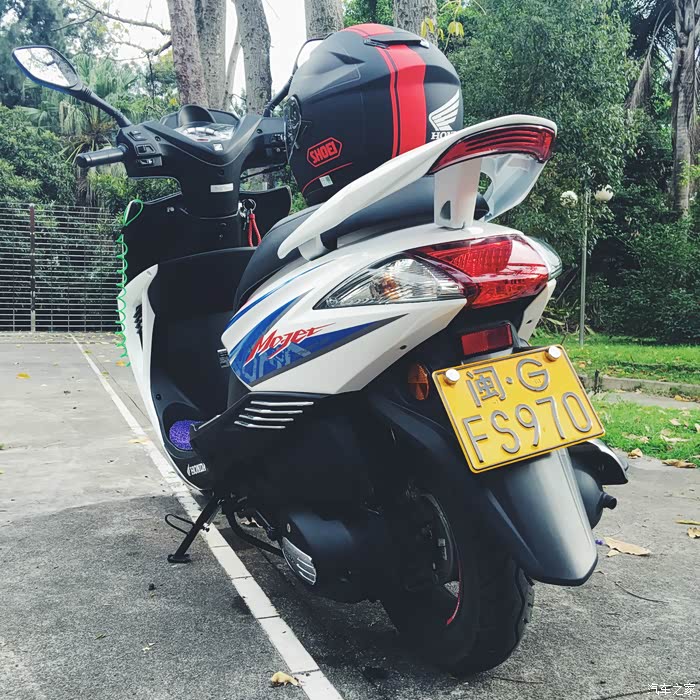 选车:有悬念吗? 当然得选本田啦! 要不前面写这么多屁话不是直接打脸了吗? 大排量重机我是驾驭不了的, 直接Pass.我的要求就是动力够用,外观运动时尚.踏板车是不二之选.本来是不知道魔戟这台车. 在我印象里踏板车都是那种黑不溜秋,灰不拉几.边上装了一圈保险杠,屁股上装个尾箱. 跟运动完全扯不上边.