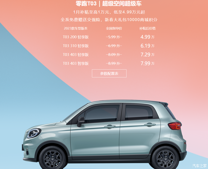 T03按照电池续航的话,可以划分为200,310,403三个类型的,个人感觉310的销量应该会最好,价格方面,最新款T03最低配全国指导价已经来到5.99万,如果加上补贴的话4.99确实是个令人心动的价格,有这个预算购车意向的朋友可按需选择购买!