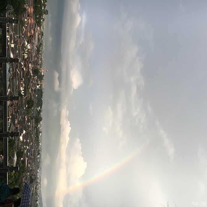 然后客栈的明明,带着我们逛傍晚的丽江。走着走着,我看其他人都在朝我背后的方向看,我也就转头看了一眼。哇,一道巨大的彩虹。就叫住了走在前边的大骚和明明。明明回头看了一眼说,快走,我们去山上看更大的。
