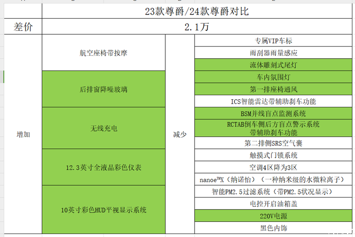 因为我一直关注的是次顶配尊爵,所以我做了一张图,24款比23款,指导价降了2.1万,增加了5项配置,减少了16项配置,可能航椅占了大头。。。