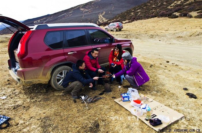 中午下哑口后,在路边生火做饭烤牛肉喝酒